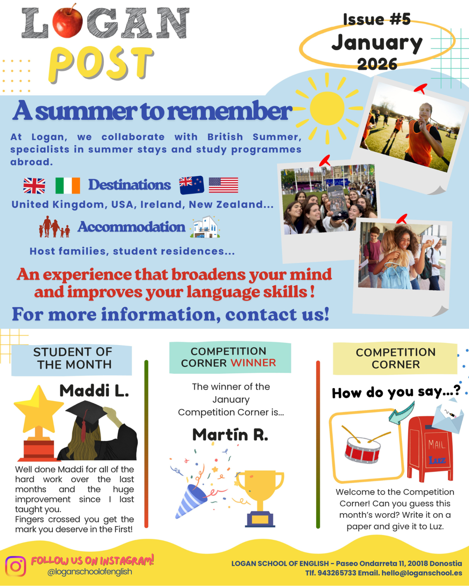 Noticias Últimas entradas January Logan Post En Novedades, Noticias Publicado el 14 de enero de 2026. Leer más October Logan Post En Novedades Publicado el 22 de octubre de 2025. Leer más September En Novedades Publicado el 20 de septiembre de 2025. Leer más June Logan Post En Novedades Publicado el 2 de junio de 2025. Leer más May Logan Post En Novedades Publicado el 2 de mayo de 2025. Leer más Holiday courses En Novedades Publicado el 5 de marzo de 2025. Leer más March Logan Post En Novedades Publicado el 3 de marzo de 2025. Leer más EXÁMENES En Novedades Publicado el 5 de octubre de 2020. Leer más Lo que les gustan a nuestros alumnos En Novedades Publicado el 14 de enero de 2019. Leer más Lo que les gustan a nuestros alumnos En Novedades Publicado el 14 de enero de 2019. Leer más Young Learner Exams En Novedades Publicado el 21 de noviembre de 2018. Leer más